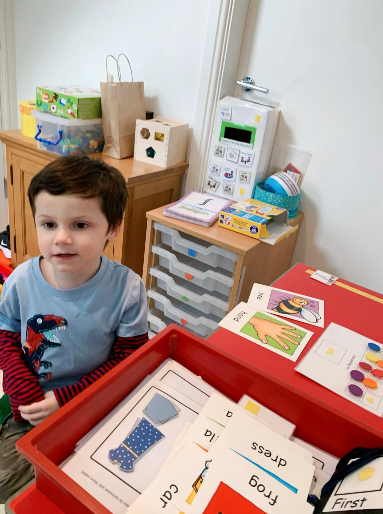 I’ve set up a replica school workstation in the hallway. It’s separate to any living space in the house and we’re only going to access it when it’s ‘school time’. I hope this will help keep school and home separate for him in his mind, while still managing to keep school a part of his life and routine. It is so important to ensure this situation doesn’t have a detrimental impact on all the progress and development he has made in the past 18 months while at school. I can’t and won’t allow that to happen.